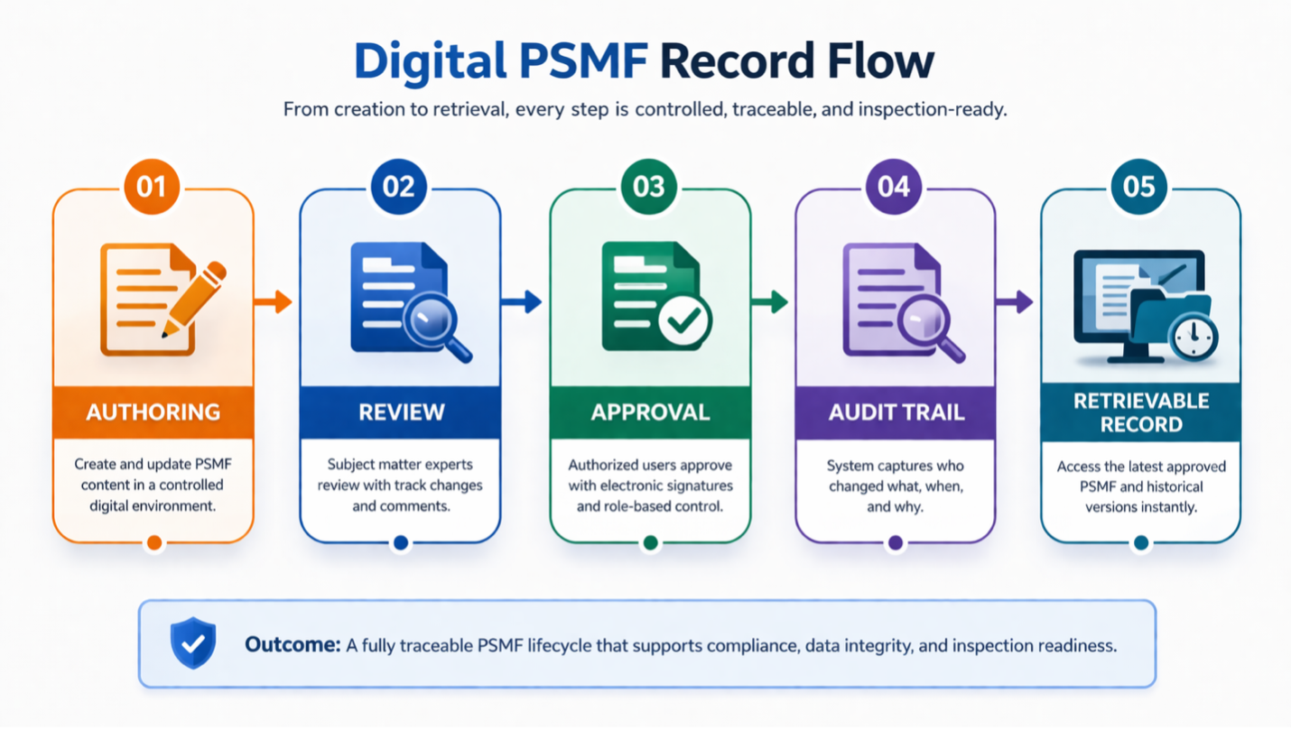 A digital PSMF system should do more than improve efficiency. It should provide clear, traceable evidence of how records are created, reviewed, approved, and maintained.